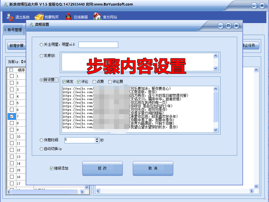 2.新浪微博全自动增加互动分工具的批量操作的时候,支持换ip操作(减少封号风险)。